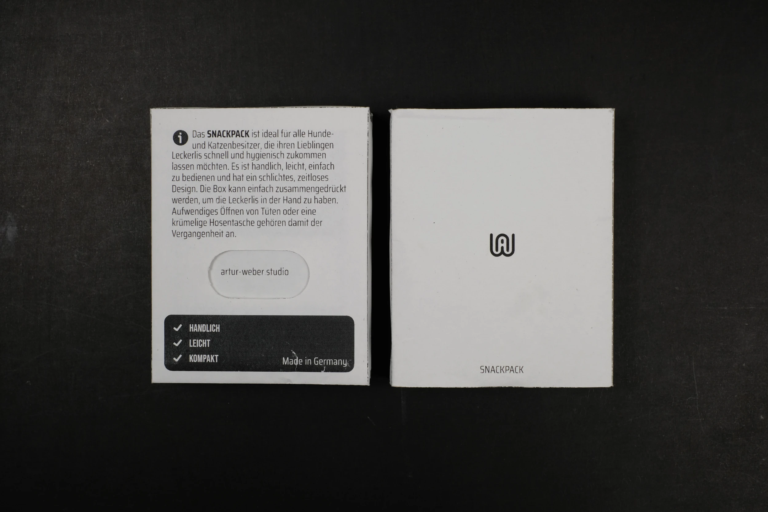 Das Projekt Snackpack entstand als eigenständige Produktidee und wurde über mehrere Jahre hinweg entwickelt. Ziel war Hundebesitzern den Alltag zu erleichtern. Anstelle loseer Leckerlis in der Tasche sollte eine kleine, saubere Box genutzt werden, die bei Bedarf eine Portion Leckerlis in die Hand des Nutzers ausgibt. Insgesamt entstanden rund 50 CAD-Dateien, die sich in sieben Hauptprototypen mit unterschiedlichen mechanischen Konzepten und Gehäuseformen gliederten.